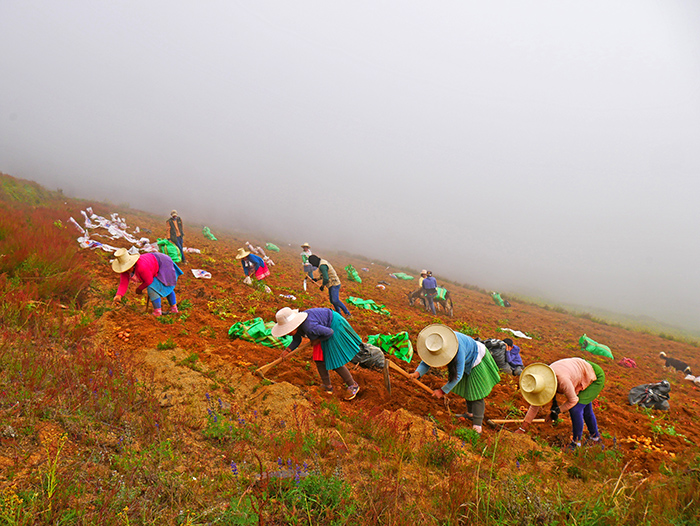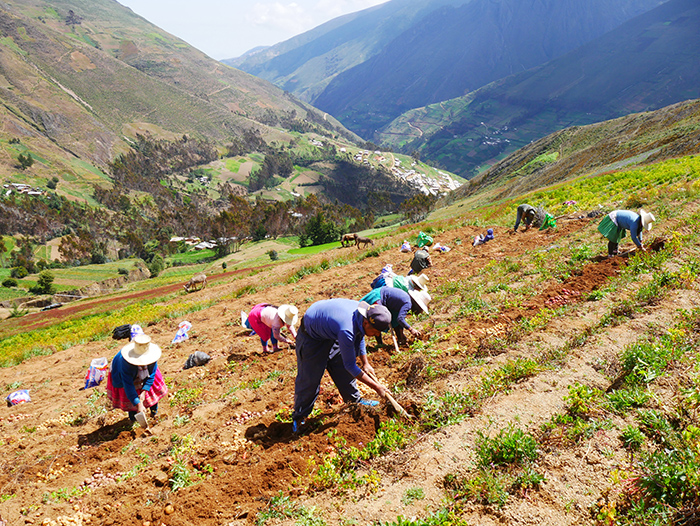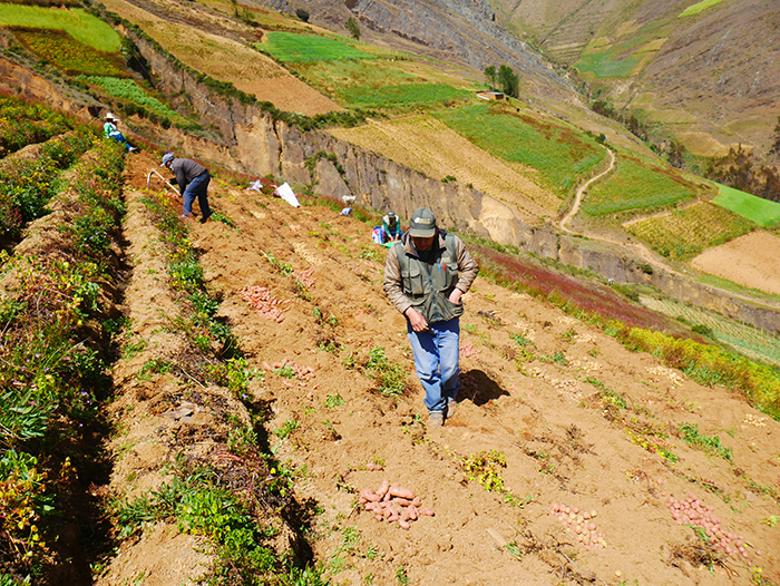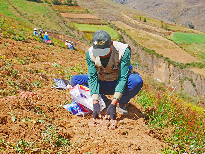 “Nuestro objetivo principal es la conservación de las papas nativas y en todo el proceso hemos enseñado a los productores cómo hacerlo. Hemos capacitado desde la distancia que deben tener los surcos (unos 80 cm.) hasta el control de plagas y enfermedades”, explicó el técnico del Servicio para el Desarrollo Integral Rural (SEDIR), Wilmer Alegre Jara. Las mujeres avanzan surco a surco y a un costado dejan montones de papas de tamaños pequeño y mediano. La neblina cubre por momentos todo el campo y hay que esforzarse para ver lo que sucede en ese alejado lugar de la sierra peruana.
